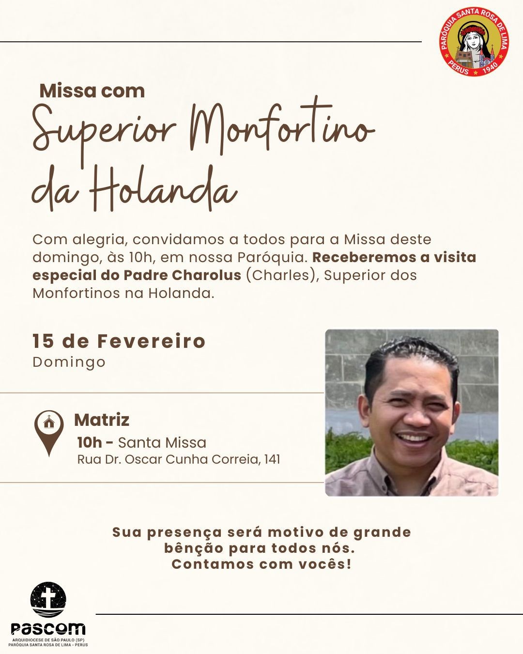 Charles Leta smm, Overste van de Nederlandse Montfortanen, is van 14 t/m 23 februari 2026 op bezoek bij confraters Pee de Waard en Antoon van Noije in Brazilië. Enerzijds om de situatie ter plaatse te leren kennen en anderzijds als steun voor pater Pee die na een ziekenhuisopname verhuisd is naar de zusters São Camilo alwaar hij de juiste zorg kan ontvangen en broeder Antoon die de zaken in goede banen heeft geleid. De video's laten zien dat Overste Charles met blijdschap en dankbaarheid werd ontvangen tijdens de H. mis op zondag 15 februari 2026.